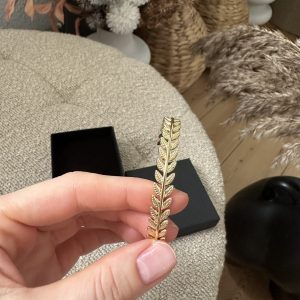 Golden Laurel Cuff er et fortryllende smykke med fint udskårne laurbærblade, der smukt omslutter dit håndled. Inspireret af antikkens symboler på sejr og ære giver det åbne cuff-design en behagelig pasform og en diskret elegance.